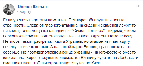 "Если увеличить детали памятника Петлюре, обнаружатся новые странности. Слева от главного атамана на сидении скамейки лежит то-ли книга, то-ли дощечка с надписью "Симон Петлюра" - видимо, чтобы персонаж не забыл, как его зовут. Но главное в другом. На коленях у Петлюры лежит раскрытая карта Украины, но атаман изучает карту почему-то вверх ногами. А на самой карте Винница расположена в совершенно противоположном конце Украины - на юго-востоке вместо юго-запада. Короче, скульптор поместил Винницу куда-то на Донбасс, и именно оттуда стрелки угрожающе тянутся на Киев", - написал он.