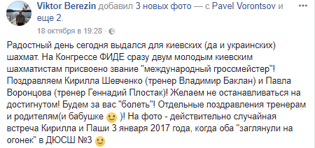 15-летний киевлянин Кирилл Шевченко получил звание международного гроссмейстера и стал самым молодым обладателем этого титула в Европе и вторым в мире. Об этом сообщается на странице Шахматного клуба ДЮСШ №3 Киева в Facebook.