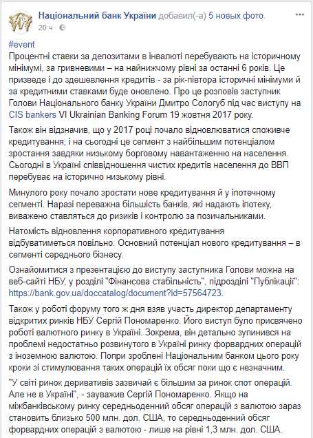 "Процентные ставки по депозитам в инвалюте находятся на историческом минимуме, по гривневым – на самом низком уровне за последние 6 лет. Это приведет и к удешевлению кредитов - за год-полтора исторические минимумы и по кредитным ставкам будет обновлен", - заявил Сологуб на CIS bankers VI Ukrainian Banking Forum.