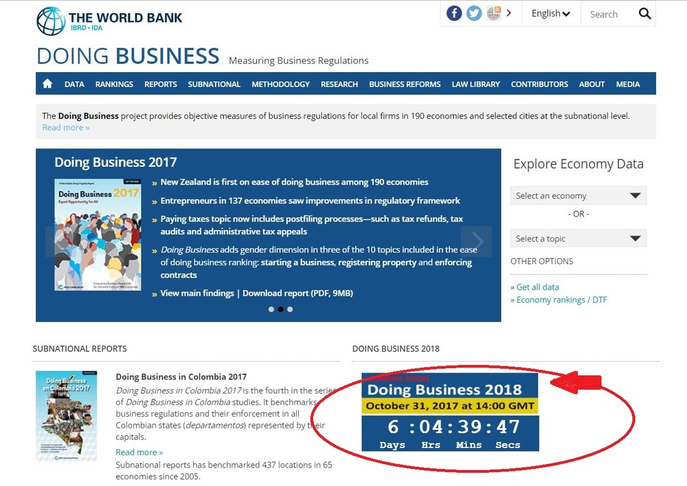 На сайте Всемирного банка раздела Doing Business отмечается, что рейтинг Doing Business-2018 будет обнародован 31 октября 2017 года в 14:00 (GMT).
