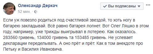 "Если уж повезло родиться под счастливой звездой, то хоть ногу в батарею закладывай. Всё равно батарея лопнет. Вот Олег Ляшко в этом году, например, уже трижды выигрывал в лотерею. Как оказалось. 283560 гривень, 134000 гривень та 153485 гривень. Не успевает декларации переделывать. А оно прёт и прёт. Как в том анекдоте про Петьку и Василия Ивановича", - пишет бизнесмен Александр Деркач.