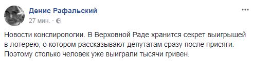 "Новости конспирологии. В Верховной Раде хранится секрет выигрышей в лотерею, о котором рассказывают депутатам сразу после присяги. Поэтому столько человек уже выиграли тысячи гривен", - журналист "Страны" Денис Рафальский.