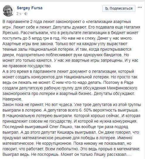 И добавляет, что уже трое депутатов из этой группы из шести человек выиграли в лотерею. "В Национальную лотерею выиграли. Которой хорошо сейчас. И которая принадлежит совсем не государству. И которой не нужна конкуренция. Последний выигравший Олег Ляшко, так вообще три раза подряд выиграл. А до этого депутат Кишкарь выигрывал. Он даже говорил, что придумал математическое решение для победы в лотерее. Именно математическое. Не коррупционное. Пока никому не показывал, но говорит, что работает. Всем любопытно. Это ведь прорыв в математике. Выиграл ведь. Не поспоришь. Может он только Ляшку рассказал... А закон про легализацию азартных игр продолжает лежать. В парламенте. А депутаты обсуждают. В тишине. Которую так любят деньги. А вы говорите теория вероятности…", - резюмировал инвестиционный банкир.