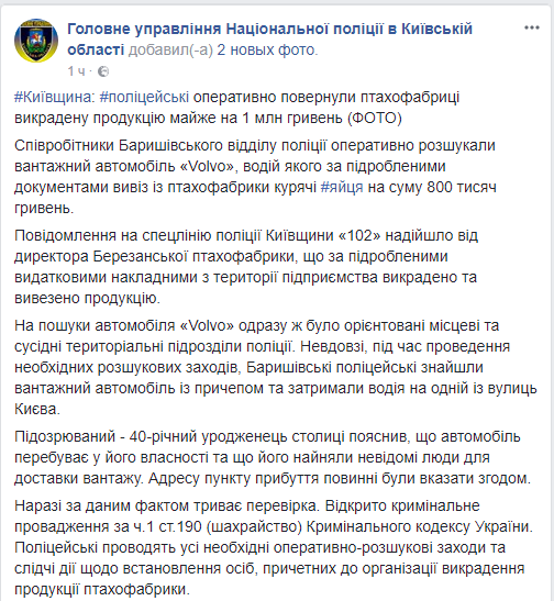 В Киеве полицейские разыскали грузовой автомобиль Volvo, водитель которого по поддельным документам вывез из Березанской птицефабрики куриных яиц на 800 тысяч гривен. Об этом сообщает пресс-служба областной полиции в Facebook.