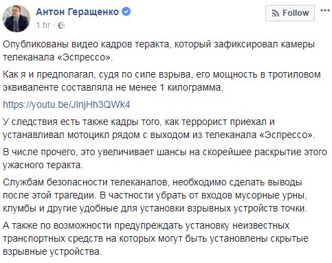 Следствие располагает кадрами, как террорист устанавливал мотоцикл рядом с выходом из телеканала "Эспрессо". Об этом на своей странице в Facebook сообщил внештатный советник министра внутренних дел Антон Геращенко.