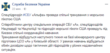 "Сотрудники центра специальных операций СБУ "А", спецподразделений Нацгвардии и Нацполиции и подразделение морской пехоты США проведут под Киевом совместные координационные обучения", - говорится в сообщении.
