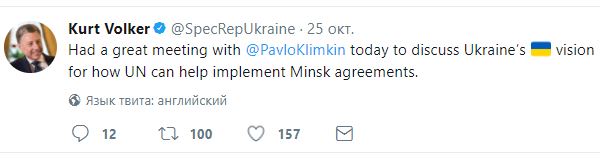 "Провел отличную встречу с Павлом Климкиным сегодня, чтобы обсудить украинское видение того, как ООН может помочь имплементировать Минские соглашения", - написал спецпредставитель США в Twitter, находясь в Берлине.