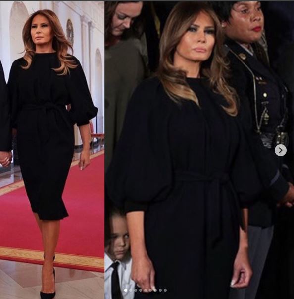 47-летняя Мелания Трамп появилась на мероприятии в элегантном черном наряде. Она выбрала строгое платье с поясом от Martin Grant, стоимостью 1116 долларов.