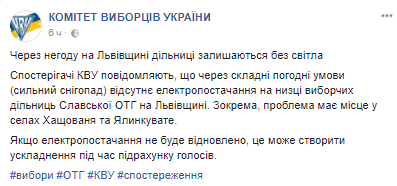 Во Львовской области из-за сложных погодных условий и снегопада отсутствует свет на некоторых избирательных участках. Об этом сообщает Комитет избирателей Украины (КИУ) на своей странице в Facebook.