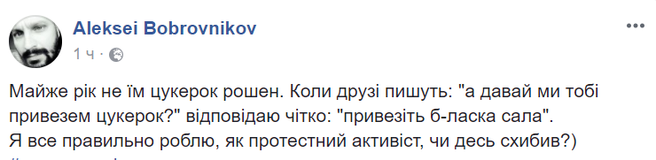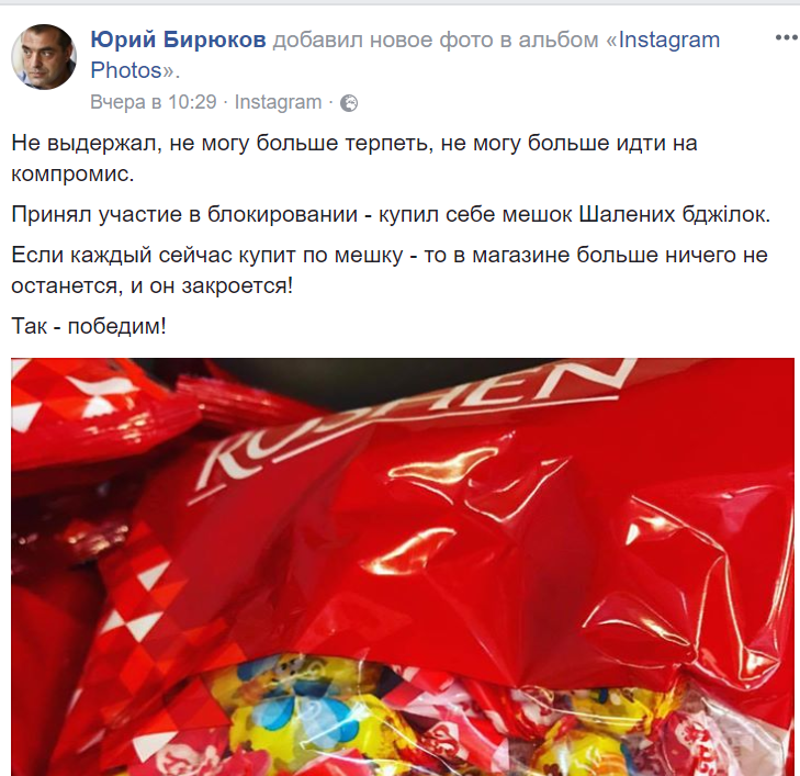 "Принял участие в блокировании - купил себе мешок Шалених бджілок. Если каждый сейчас купит по мешку - то в магазине больше ничего не останется, и он закроется!", - написал в Facebook советник Порошенко Юрий Бирюков.