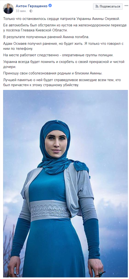 "Только что остановилось сердце патриота Украины Амины Окуевой. Ее автомобиль был обстрелян из кустов на железнодорожном переезде у посёлка Глеваха Киевской Области. В результате полученных ранений Амина погибла" - сообщил Геращенко.