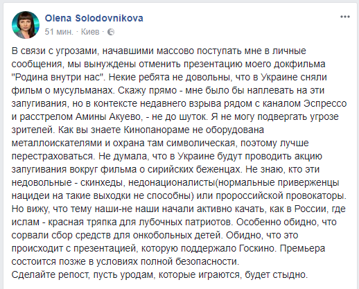 "В связи с угрозами, начавшими массово поступать мне в личные сообщения, мы вынуждены отменить презентацию моего докфильма "Родина внутри нас". Некие ребята не довольны, что в Украине сняли фильм о мусульманах", - сообщила Солодовникова.