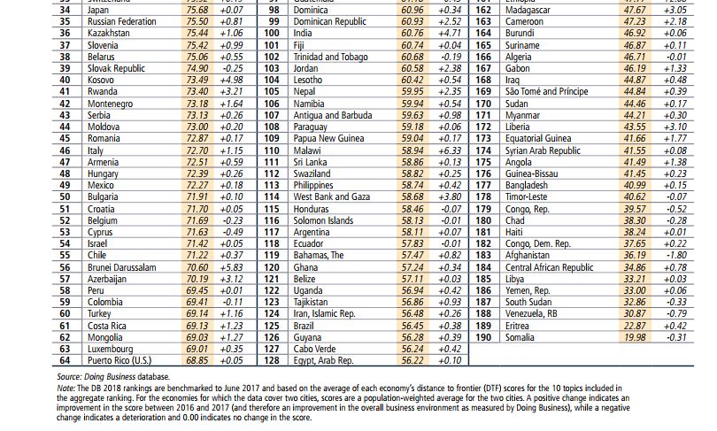 В ежегодном рейтинге Doing Business – 2018 (составляется группой Всемирного банка) Украина поднялась на 4 позиции среди 190 стран и заняла 76 место.