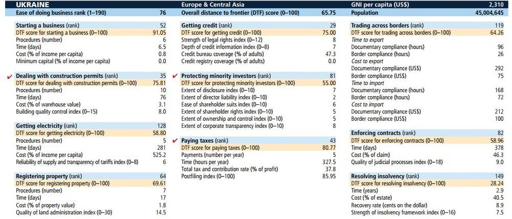 В рейтинге Doing Business Украина заняла 76 место, поднявшись на 4 позиции. Россия на 35 месте