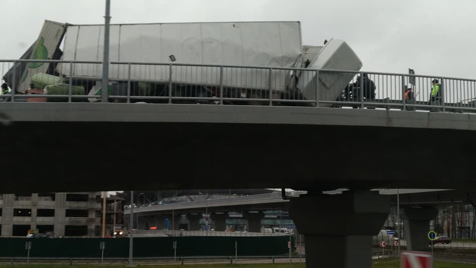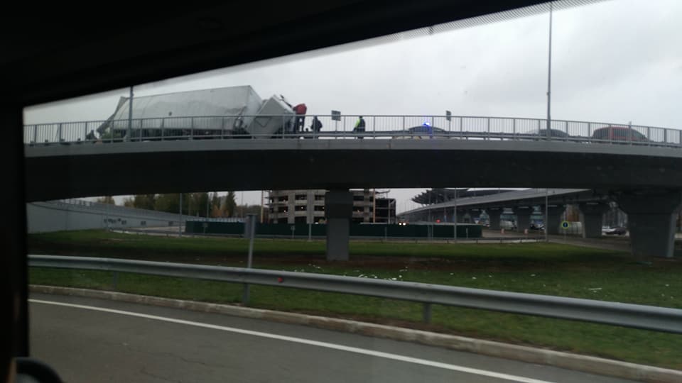 Сегодня, 31 октября, в аэропорту "Борисполь" произошло второе за день ЧП. Вслед за столкновением грузовика с самолетом, на эстакаде, которая ведет к выходу на третьем этаже терминала D, перевернулся грузовик.