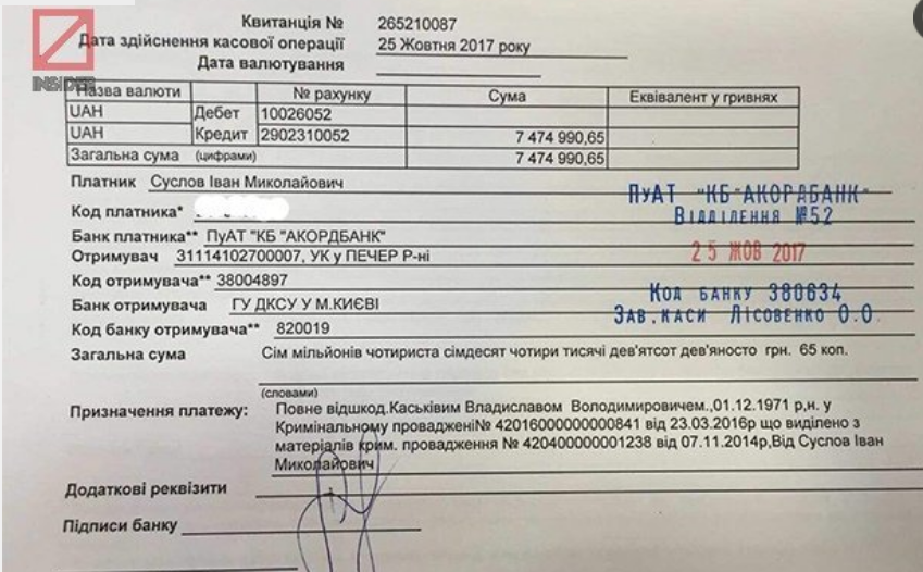 Президент агропромышленной корпорации "Сквира" Иван Суслов возместил государству сумму, в присвоении которой подозревают экс-главу Госагентства по инвестициям и управлению нацпроектами Владислава Каськива. Об этом свидетельствует платежное поручение. Средства были внесены через "Аккордбанк" еще 25 октября. Речь идет о сумме в 7,47 млн грн.