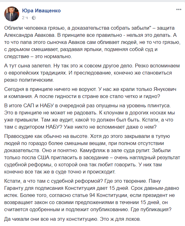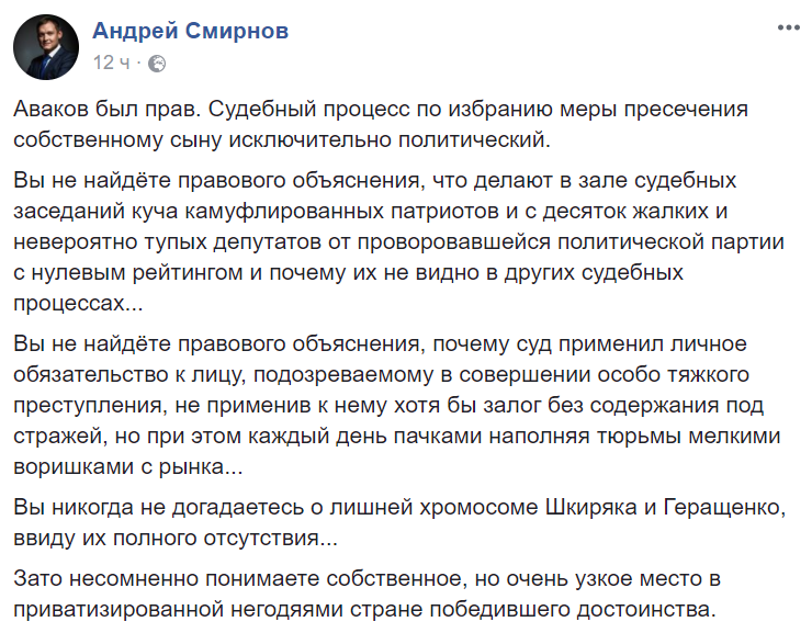 О более строгих приговорах к людям, которые не имеют такой "группы поддержки", как сын Авакова, пишет и адвокат Андрей Смирнов.