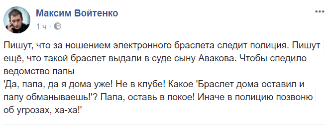 "Пишут, что за ношением электронного браслета следит полиция. Пишут ещё, что такой браслет выдали в суде сыну Авакова. Чтобы следило ведомство папы.