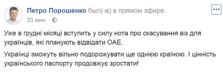 "Уже в декабре вступит в силу нота об отмене виз для украинцев, которые планируют посетить ОАЭ. Украинцы смогут свободно путешествовать еще в одну страну", - сообщил Порошенко.