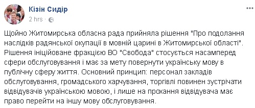 "Только что Житомирский областной совет принял решение "О преодолении последствий советской оккупации в языковой области в Житомирской области". Решение, инициированное фракцией ВО "Свобода", касается прежде всего сферы обслуживания и имеет целью вернуть украинский язык в публичную сферу жизни. Основной принцип: персонал учреждений обслуживания, общественного питания, торговли должен встречать посетителей на украинском языке, и только по просьбе посетителя имеет право перейти на другой язык обслуживания", - отмечается в сообщении.