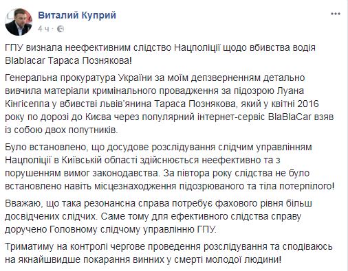 ГПУ признала неэффективным расследование в течение полутора лет следователями полиции убийства водителя BlaBlaCar Тараса Познякова.