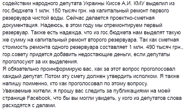 Мэр Владимир Михов заверил, что проблему уже решают. По крайней мере, в Кабмине уже выделили 1 150 000 грн на капитальный ремонт первого резервуара чистой воды, и сейчас разрабатывается проектно-сметная документация.