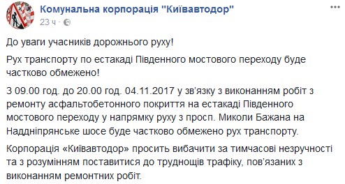 "С 09:00. до 20:00. 04.11.2017 в связи с выполнением работ по ремонту асфальтобетонного покрытия на эстакаде Южного мостового перехода в направлении движения с просп. Николая Бажана на Надднепрянское шоссе будет частично ограничено движение транспорта", – говорится в сообщении.