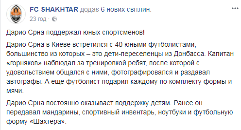 Дарио Срна постоянно оказывает поддержку детям. Ранее он передавал мандарины, спортивный инвентарь, ноутбуки и футбольную форму "Шахтера".