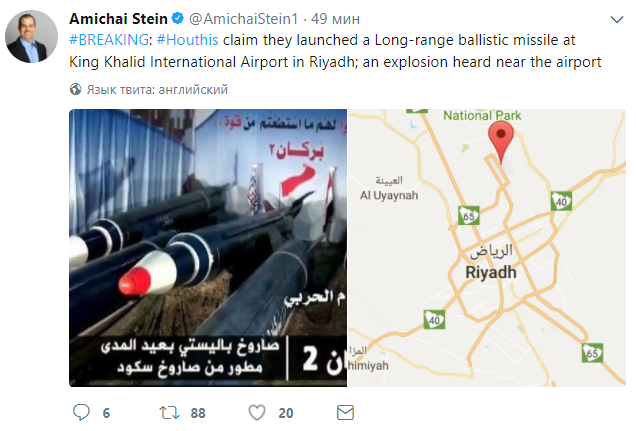 Это случилось в одном из терминалов международного аэропорта имени короля Халида в 35 км от Эр-Рияда. По неподтвержденным данным от местных СМИ, взрыв произошел вследствие перехвата ПВО Саудовской Аравии ракеты, выпущенной из Йемена.