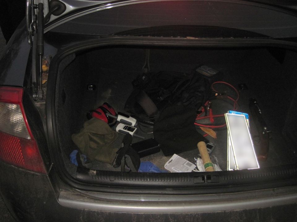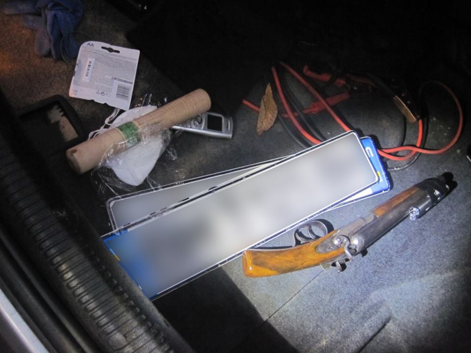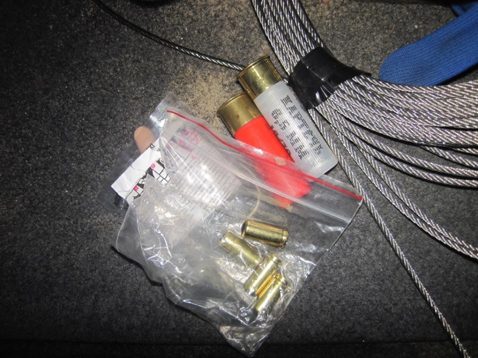 "В багажном отделении было обнаружено ружье с обрезанным стволом марки "Боб-52" с двумя патронами 16-го калибра, 2 радиостанции, 2 балаклавы, комплект номерных знаков и рюкзак, в котором находились 2 патрона к обрезу 16-го калибра и 4 патрона калибра 9 мм травматического действия. Кроме этого, в салоне автомобиля под сиденьем водителя правоохранители обнаружили травматический пистолет марки "Форт-12РМ" с 12 патронами калибра 9 мм, в ящике для мелких вещей 1 охотничий нож, а в двери водителя - металлический телескоп, электрошокер и монокуляр", - сказано в сообщении.