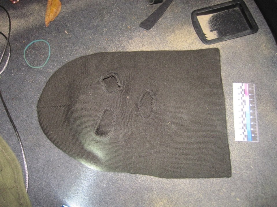 При дальнейшем осмотре в автомобиле было обнаружено и другое оружие, а также маска, сделанная из шапки.