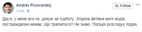 "Друзья, у меня все ок, спасибо за заботу. Сгорела машина моего водителя, пострадавших нет. Что случилось? Не знаю. Полиция расследует происшествие.