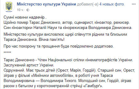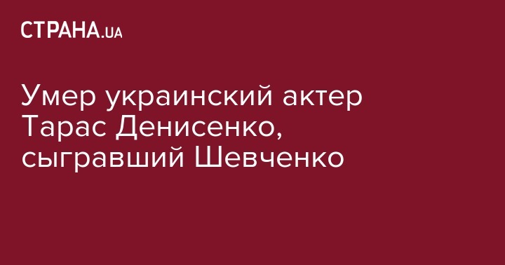 Во вторник, 7 ноября, на 53-м году жизни умер украинский актер, сценарист, киноактер, режиссер Тарас Денисенко. Об этом сообщает Министерство культуры в Facebook.