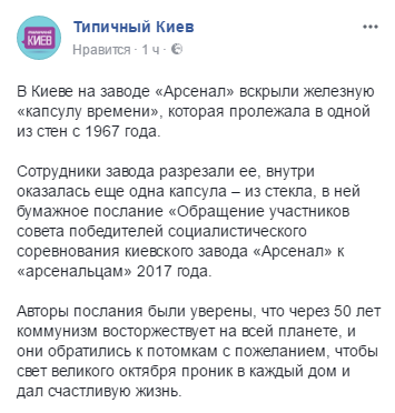 Как сообщает "Типичный Киев" в Facebook, сотрудники завода разрезали капсулу, внутри оказалась еще одна капсула – из стекла, в ней бумажное послание "Обращение участников совета победителей социалистического соревнования киевского завода "Арсенал" к "арсенальцам" 2017 года.