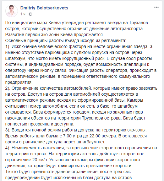 "Утвержден новый регламент въезда на Труханов остров, который существенно ограничит движение транспорта. С понедельника регламент должен вступить в действие", - написал он.
