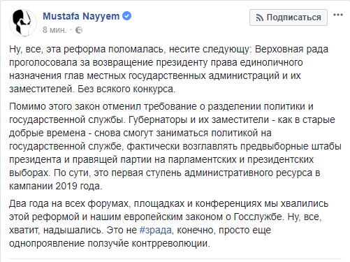 "Губернаторы и их заместители - как в старые добрые времена - снова смогут заниматься политикой на государственной службе, фактически возглавлять предвыборные штабы президента и правящей партии на парламентских и президентских выборах. По сути, это первая ступень административного ресурса в кампании 2019 года", - констатирует нардеп от БПП.