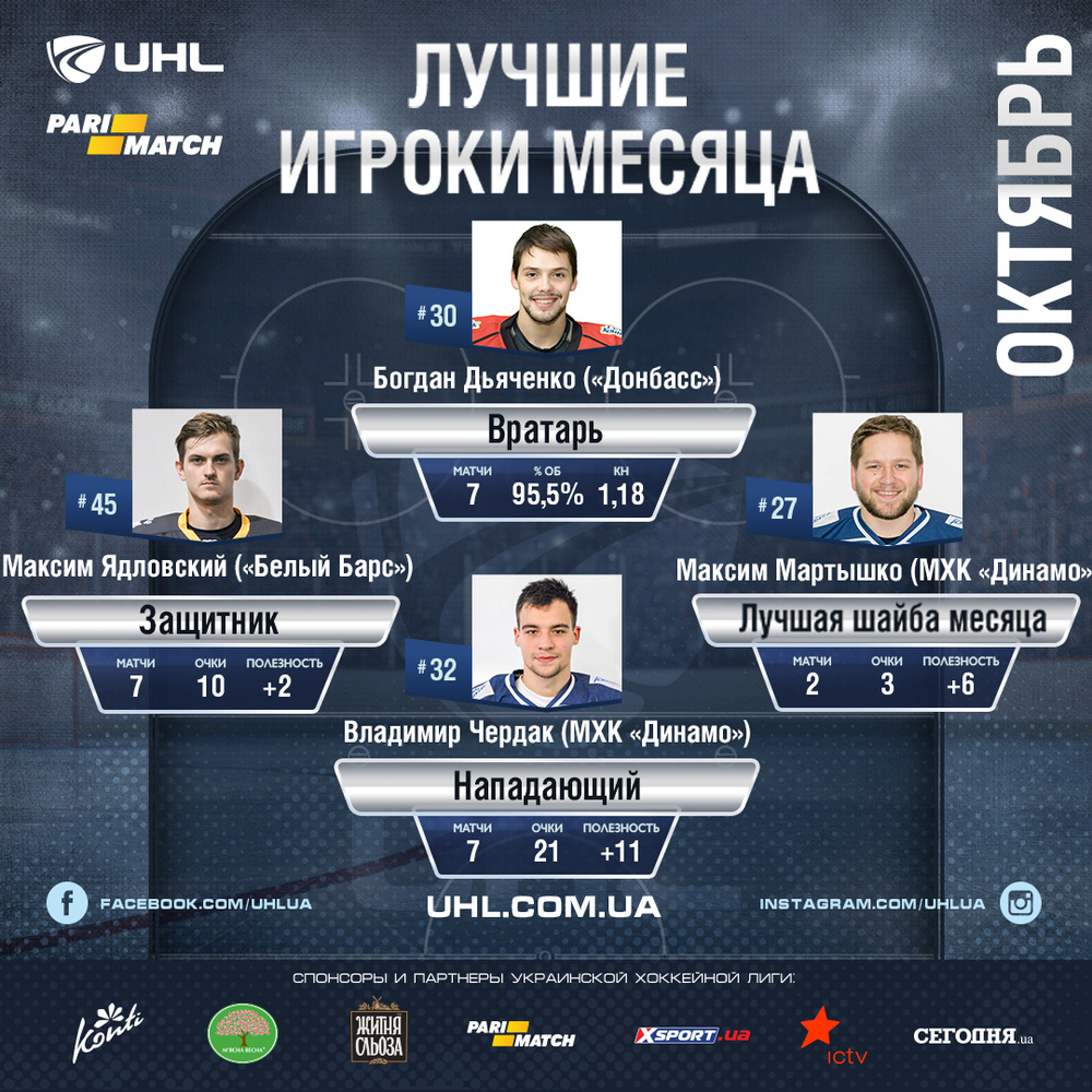 Украинская хоккейная лига совместно с официальным спонсором чемпионата ТМ "Parimatch" определили лучших хоккеистов октября в чемпионате Украины по хоккею – чемпионате Украинской хоккейной лиги (УХЛ).