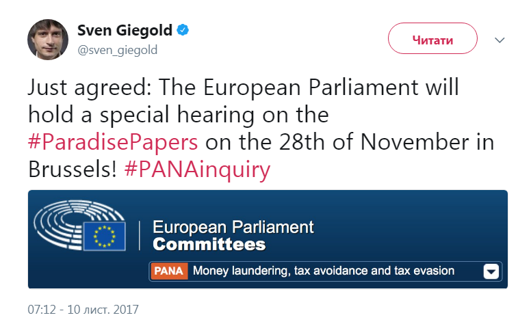 "Европейский парламент 28 ноября в Брюсселе проведет специальное слушание по Paradise Papers", - написал он.