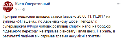В Киеве произошел несчастный случай на остановке "бульвар Ярослава Гашека" на Харьковском шоссе. Об этом в Facebook сообщает "Киев Оперативный".