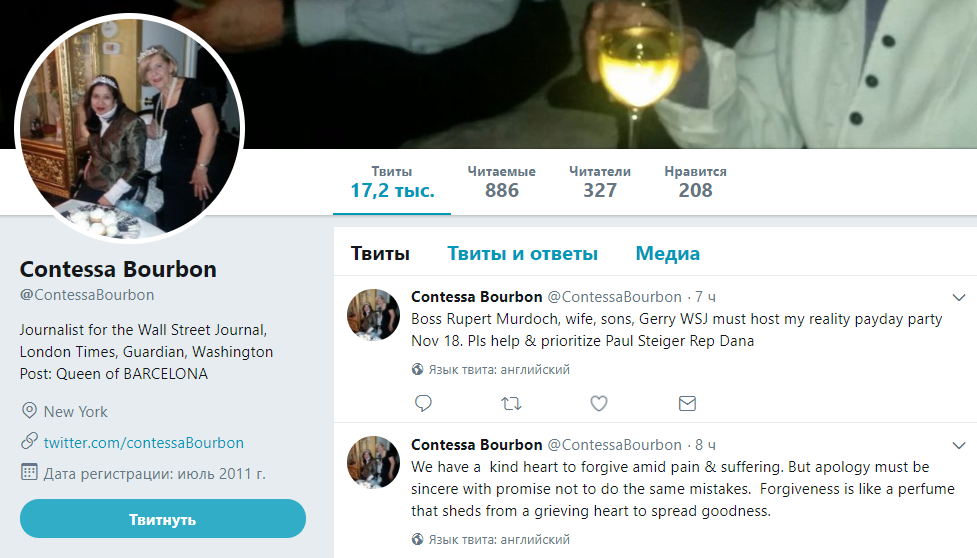 Контесса Бурбон впервые представилась сотрудницей New York Times в мае 2015 года, когда брала якобы от имени издания интервью у посла Турции.