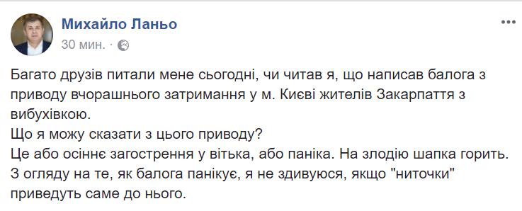 "По моей информации, задержанные в Киеве со взрывчаткой действительно являются жителями Мукачево. Один - Евгений Гончаренко, другого, как мне сказали, называют "Марчи". Оба участники ОПГ народного депутата Михаила Ланьо и его помощника - Артура Пашкуляка, известного в криминальном мире под кличкой Тайсон.