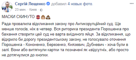 "Еще меньше голосов, чем в четверг. Вся риторика президента Порошенко о желании создать этот суд не стоит выеденного яйца. За отзыв, что открыло бы дорогу президентскому закону, не голосовало окружения Порошенко - Кононенко, Березенко, Князевич, Дубневич - хотя были в зале. Они либо вытащили карточки и обозначены как отсутствующие, или просто не дотянулись до кнопки", - написал Лещенко.