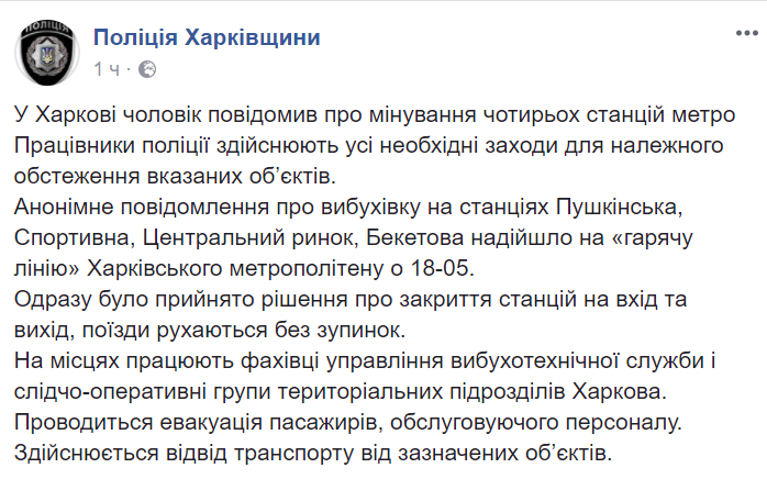 В Харькове в час пик неизвестный сообщил о заминировании сразу четырех станций метро: Пушкинской, Спортивной, Бекетова и Центрального рынка.