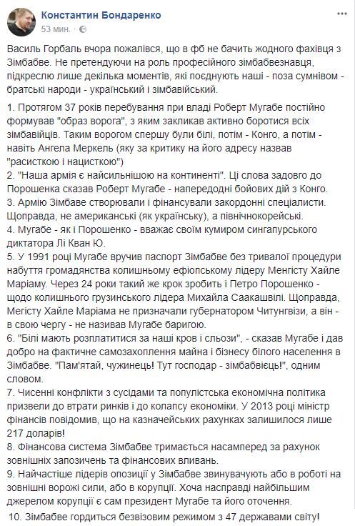 Политолог Константин Бондаренко написал пост в Facebook, в котором проводит интересные параллели между Зимбабве и Украиной: "Василий Горбаль вчера пожаловался, что в фб не видит ни одного специалиста по Зимбабве. Не претендуя на роль профессионального зимбабвеведа, подчеркну лишь несколько моментов, которые объединяют наши - несомненно - братские народы - украинский и зимбавийский.