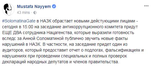 "#SolomatinaGate в НАПК обрастает новыми дейстующими лицами – сегодня в 15:00 на заседание антикоррупционного комитета придут еще два сотрудника Нацагентства, которые выразили готовность вслед за Анной Соломатиной публично озвучить новые факты нарушений в НАПК", – пишет нардеп.