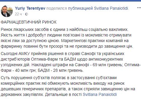"АМКУ принял решение в деле Sanofi и украинских дистрибьюторов Оптима-фарм и БАДМ относительно антиконкурентных согласованных действий. Наложены штрафы на Sanofi - 69 млн гривень; Оптима-фарм - 40 млн грн; БАДМ - 28 млн гривень", - отметил он.