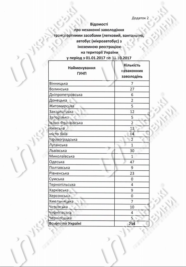 Национальная полиция Украины зафиксировала 294 случая незаконного завладения транспортными средствами (легковой, грузовой, автобус и микроавтобус) с иностранной регистрацией на территории Украины, города Киева и Киевской области в период с 1 января по 31 октября 2017 года.
