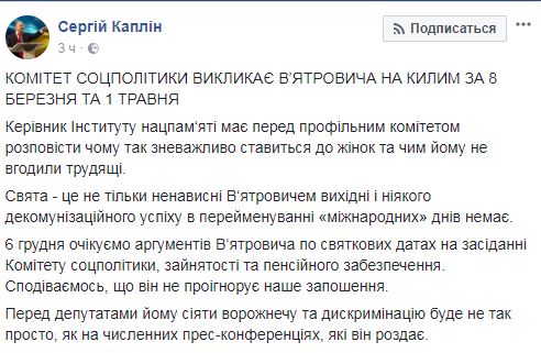 Каплин выразил надежду, что руководитель Института национальной памяти не проигнорирует приглашение на собрание и расскажет, почему так пренебрежительно относится к женщинам и чем ему так не угодили трудящиеся. А также добавил, что праздники - это не только ненавистные Вятровичу выходные и никакого декоммунизационного успеха в переименовании "международных дней" нет.