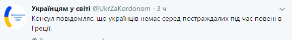 "Консул сообщает, что украинцев нет среди пострадавших во время наводнения в Греции", - говорится в сообщении.