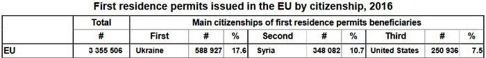 Отмечается, что что Украина лидирует по числу переселенцев в ЕС уже несколько лет подряд. В 2015 году гражданам Украины было выдано 500 тысяч разрешений на проживание, в 2014 году - почти 303 тысячи, в 2013 - около 237 тысячи.